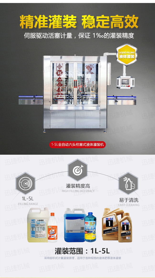 該機是我司很新研制的潤滑油定量灌裝機,設備集光、電、氣于一體,由PLC配合人機界面(觸摸屏)控制,從進瓶、定位、灌裝、出瓶等動作均全自動完成。采用直流式灌裝,與物料接觸部分均采用出色不銹鋼和食品級材料制成,符合食品衛(wèi)生要求;自動化程度高,性能穩(wěn)定,生產(chǎn)速度快,灌裝準確,操作簡單、調整方便,適應性強等特點。