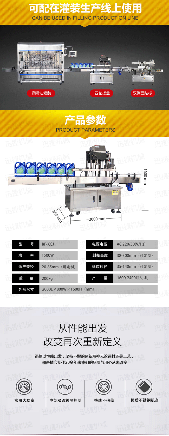全自動旋蓋機是參照國機型改進設計、旋蓋速度快,合格率高、操作方便??蛇m用于食品、制藥、日化、農(nóng)藥、化妝品等行業(yè)的不同瓶形的旋蓋。四臺調(diào)速電機分別用于供蓋、夾瓶、傳送、旋蓋,機器自動化程度高,穩(wěn)定性好,調(diào)節(jié)方便,更換瓶形或蓋時無須備件,只需作調(diào)整即可完成(如配上蓋機,可進行自動上蓋)可以根據(jù)實際需要選配。