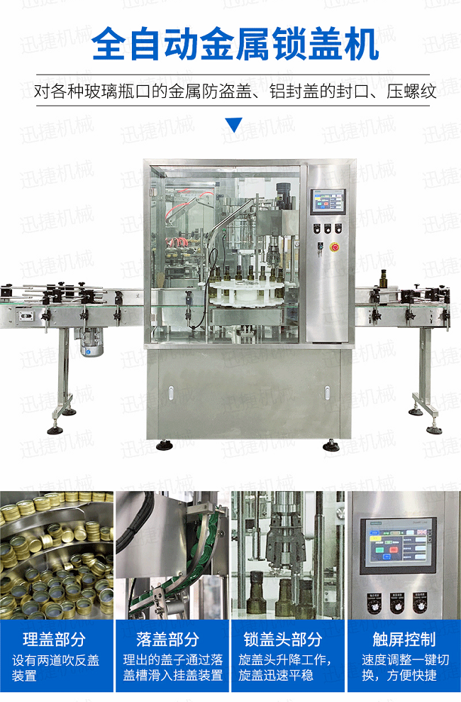 本設(shè)備適用于食品、化妝品、化工等行業(yè),主要針對各種玻璃瓶口的金屬防盜蓋鋁封蓋的封口、壓螺紋等。該設(shè)備可單機(jī)使用,也可以與灌裝機(jī)等設(shè)備組成生產(chǎn)流水線自動作業(yè);