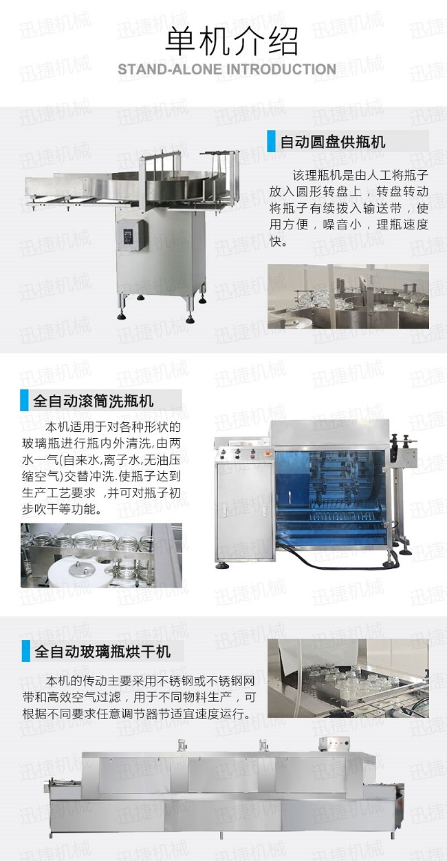 自動(dòng)供瓶機(jī)+全自動(dòng)滾筒洗瓶機(jī)+自動(dòng)六米烘干機(jī)+自動(dòng)收瓶機(jī)+全自動(dòng)六頭灌裝機(jī)自動(dòng)灌裝+全自動(dòng)提蓋機(jī)自動(dòng)理蓋、提蓋、掛蓋+六頭真空旋蓋機(jī)同時(shí)六個(gè)頭真空旋蓋+套標(biāo)機(jī)+收縮機(jī)+圓瓶貼標(biāo)機(jī)+整理平臺(tái);