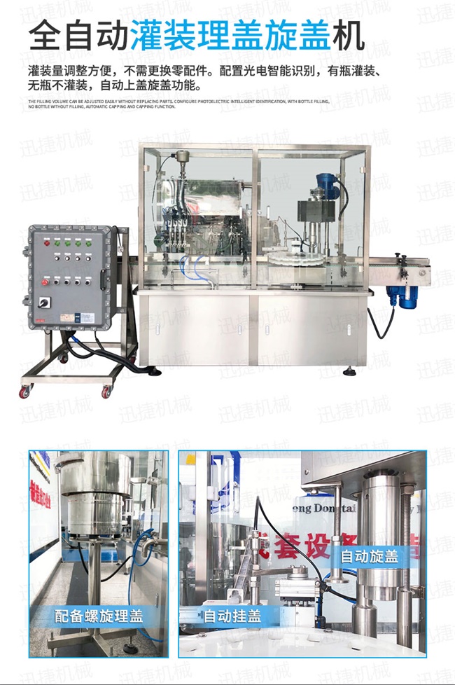 全自動(dòng)凝膠生產(chǎn)線適用于消毒凝膠、免洗手洗手液、免洗手消毒凝膠、消毒液、84消毒液、醫(yī)用酒精、75%酒精消毒液、75度酒精、消毒水、殺菌消毒劑、醫(yī)用酒精、碘酒、次氯酸鈉、劑、醫(yī)用乙醇消毒液、瓶裝消毒劑等產(chǎn)品,有多頭全自動(dòng)消毒液灌裝機(jī)和封箱機(jī)、貼標(biāo)機(jī)、打包機(jī)、噴碼機(jī)等配套設(shè)備組成,實(shí)現(xiàn)消毒液自動(dòng)灌裝,自動(dòng)旋蓋,自動(dòng)貼標(biāo),從灌裝、到成品的全部過程