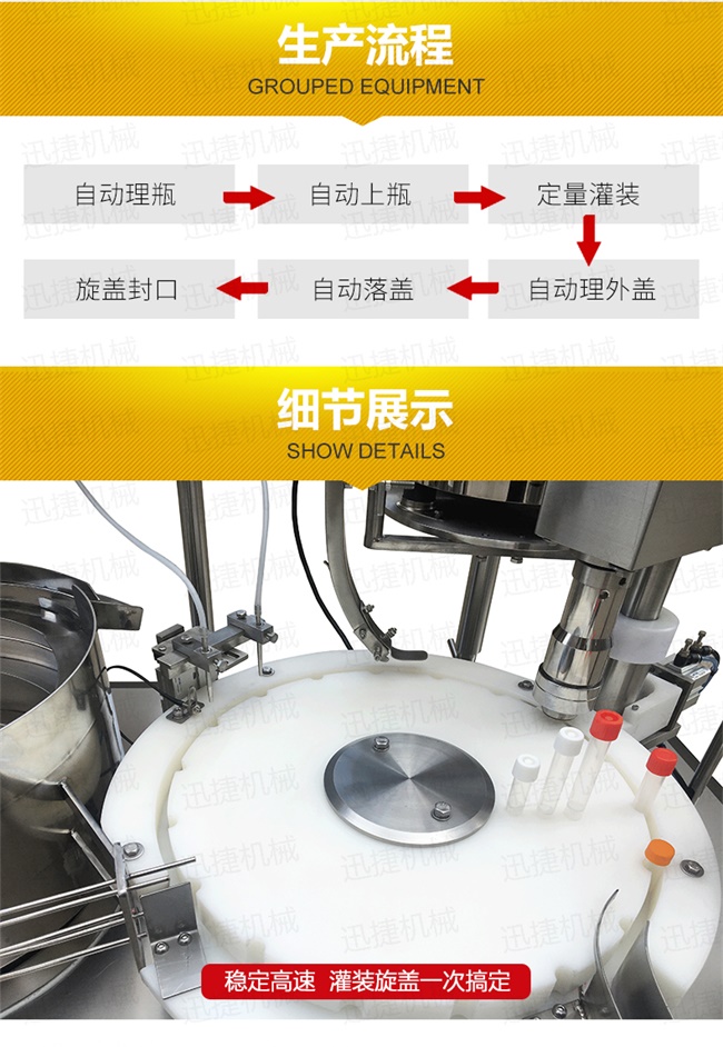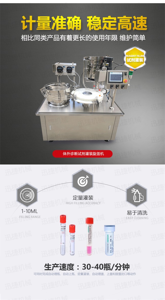 本機是在引進和吸收國外技術的基礎上,由我公司自主研發(fā)的一款IVD診斷試劑灌裝旋蓋一體機,能同時完成自動理瓶、自動上瓶、定量灌裝、自動理蓋、上蓋和旋蓋封口等動作。本機采用日本高精度封閉式凸輪分度工位器,精度高,運行可靠,使用壽命長。該分度器結構簡單,長期使用無需維修。該型號設備主要用于ⅣD體外診斷試劑制藥、生物制藥行業(yè)及科研領域裝。機器設計緊湊合理、外形簡潔美觀,灌裝量調節(jié)方便。