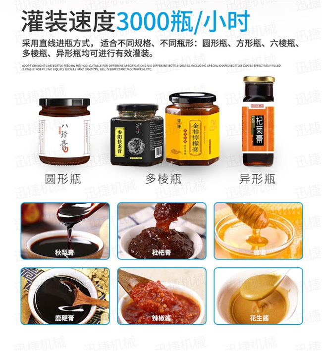 枇杷膏自動(dòng)灌裝機(jī)生產(chǎn)流水線適用于各種1、各種膏滋如:秋梨膏、枇杷膏、鹿鞭膏、蜂蜜等的灌裝。2、調(diào)味醬如:香菇醬、辣椒醬、豆瓣醬、花生醬、芝麻醬、牛油火鍋底料、紅油火鍋底料。3、采用多規(guī)格的灌裝轉(zhuǎn)閥、灌裝頭,可適應(yīng)不同客戶物料的灌裝需求。