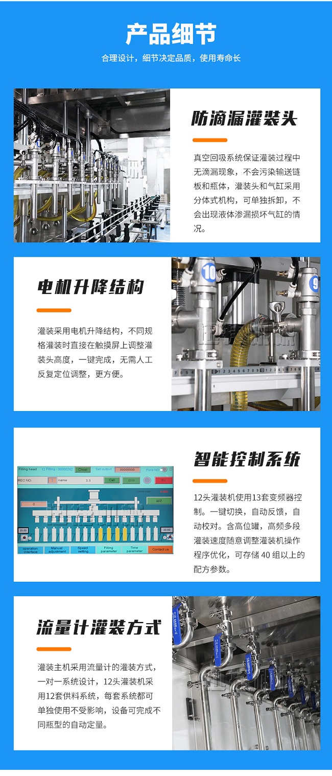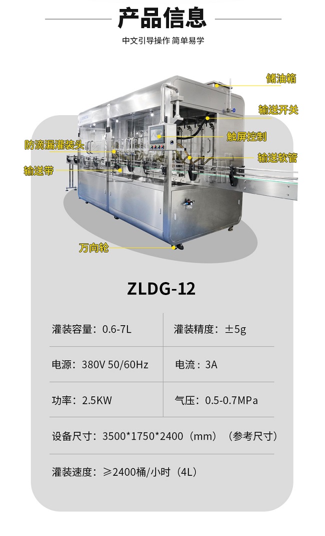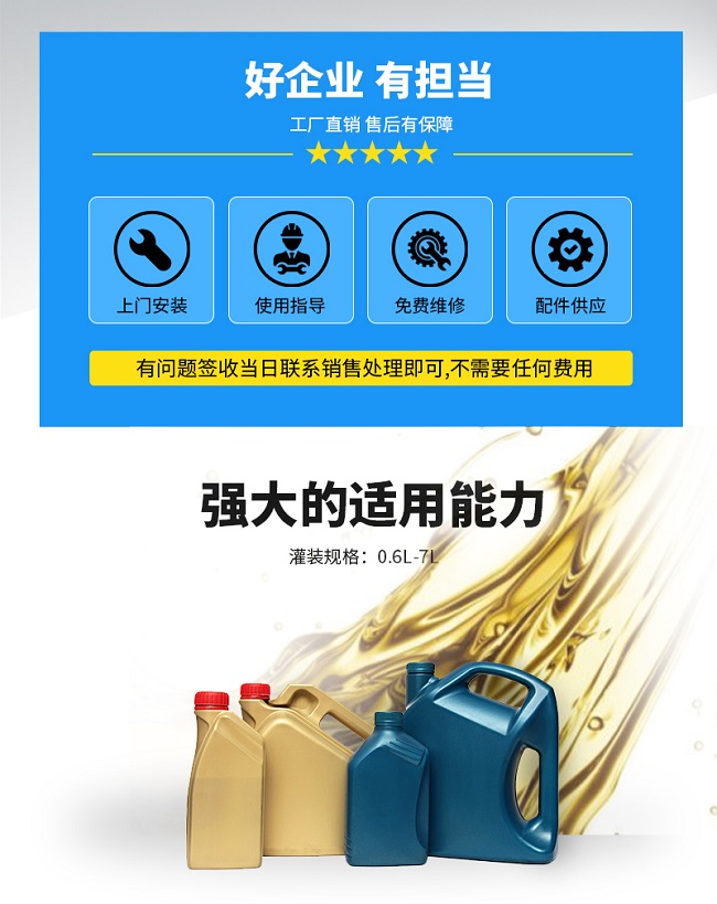 機(jī)器應(yīng)用范圍:1-10升通用型號(hào),機(jī)器采用流量計(jì)計(jì)量,觸摸屏控制,參數(shù)一鍵調(diào)整,方便快捷。可以灌裝各種油脂,油料。灌裝頭采用專用的油脂防滴漏灌裝頭,不滴漏。機(jī)器設(shè)定有快慢速技術(shù),可以先快后慢,防止物料噴濺。保持生產(chǎn)車間干凈潔凈。