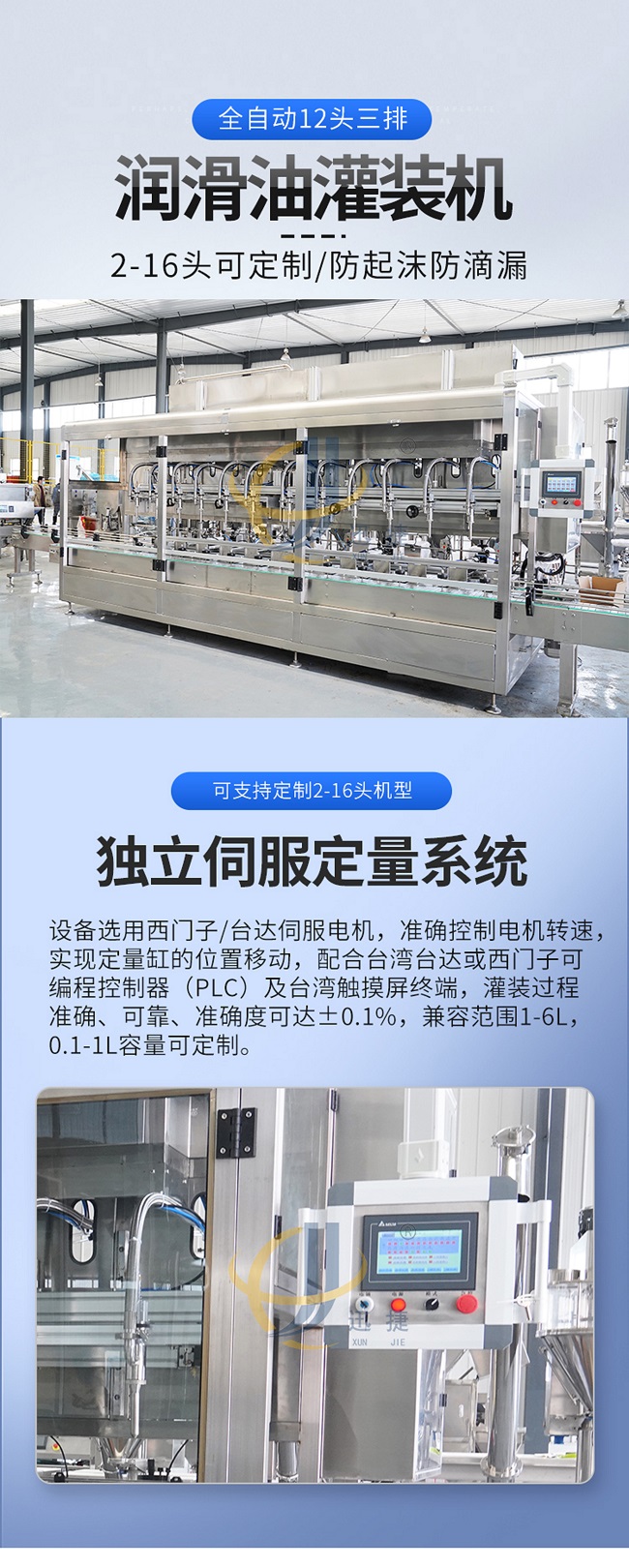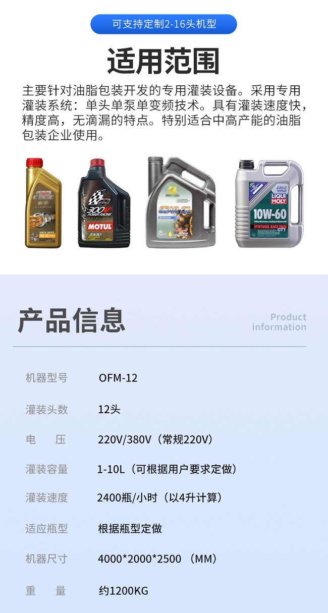 這款全自動(dòng)十二頭三排潤(rùn)滑油灌裝機(jī)是本公司專為潤(rùn)滑油廠家研發(fā)的自動(dòng)化設(shè)備,這款潤(rùn)滑油灌裝機(jī)2-16頭可定制,防起沫防滴漏。主要針對(duì)油脂包裝開(kāi)發(fā)的專用灌裝設(shè)備。采用專用灌裝系統(tǒng):?jiǎn)晤^單泵單變頻技術(shù)。具有灌裝速度快,精度高,無(wú)滴漏的特點(diǎn)。特別適合中高產(chǎn)能的油脂包裝企業(yè)使用。