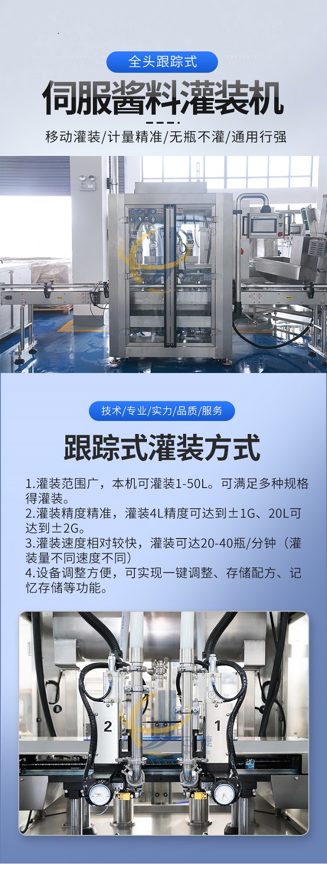 這款全自動(dòng)跟蹤式醬料灌裝機(jī)是本公司研發(fā)的新款專為醬廠研發(fā)的生產(chǎn)設(shè)備,跟蹤式醬料灌裝機(jī)適用范圍:沙拉汁、調(diào)味汁、千島醬、番茄醬、胡椒醬、糖漿、蜂蜜、枇杷膏、辣椒醬、牛肉醬、洗手液、洗衣液等的灌裝。
